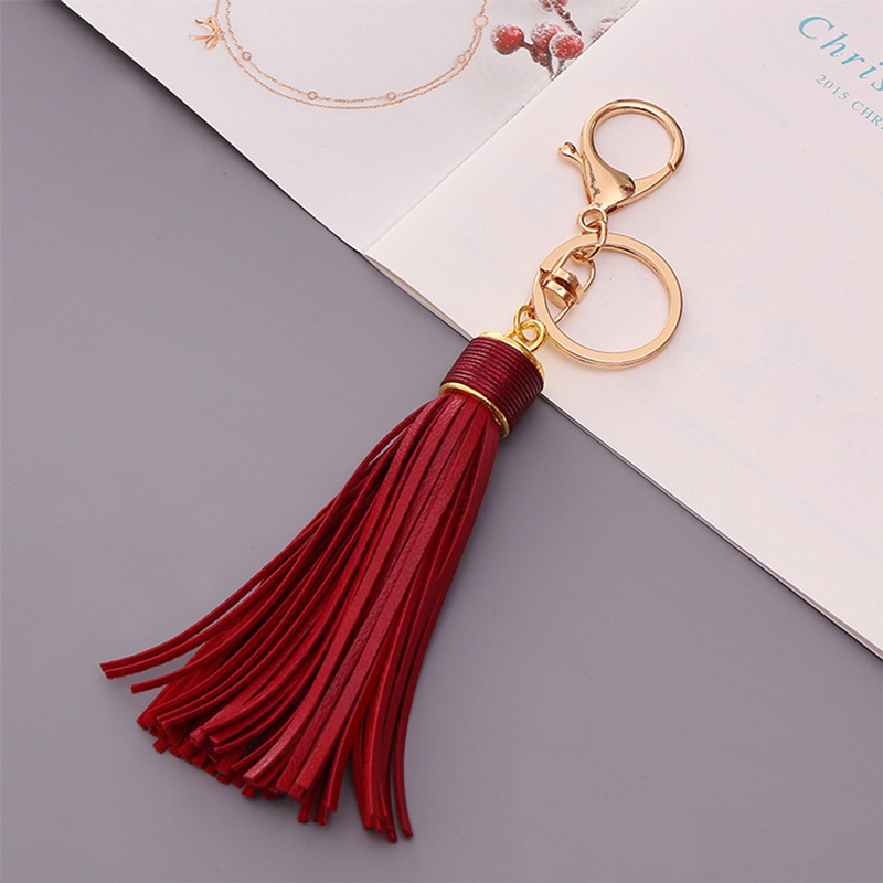 These keychains come in red, gray, brown, and black, each with a tassel design. They feature gold metal rings and clasps, blending vibrant colors with elegant hardware, ideal as stylish and versatile accessories.