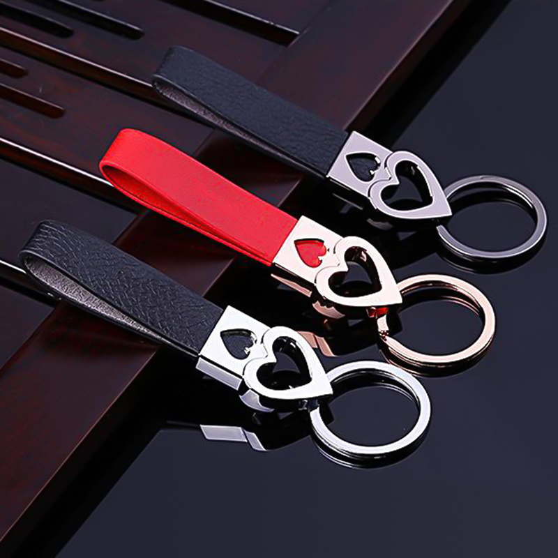 These keychains feature heart-shaped metal accents and leather straps in black and red. With shiny metal rings, they blend romantic design and sleek craftsmanship, ideal as couple accessories or stylish key holders.