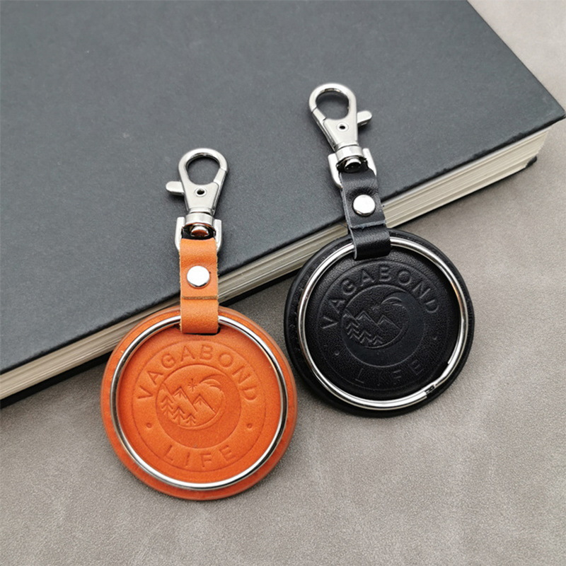These keychains feature circular leather discs (orange and black) engraved with “VAGABOND LIFE” and a logo, paired with metal rings and clasps. They blend minimalist design and durable craftsmanship, ideal as stylish travel-inspired accessories.