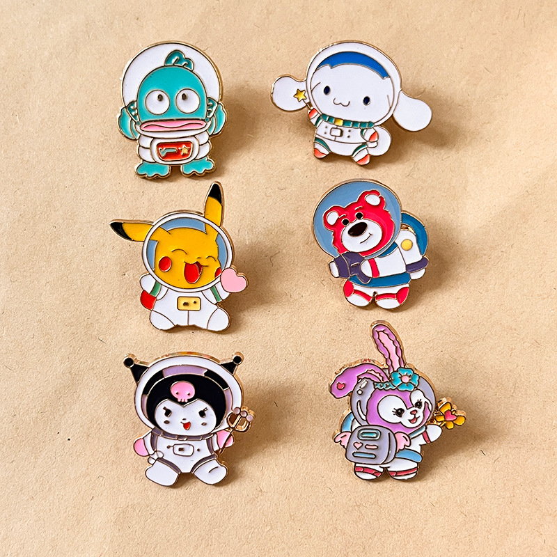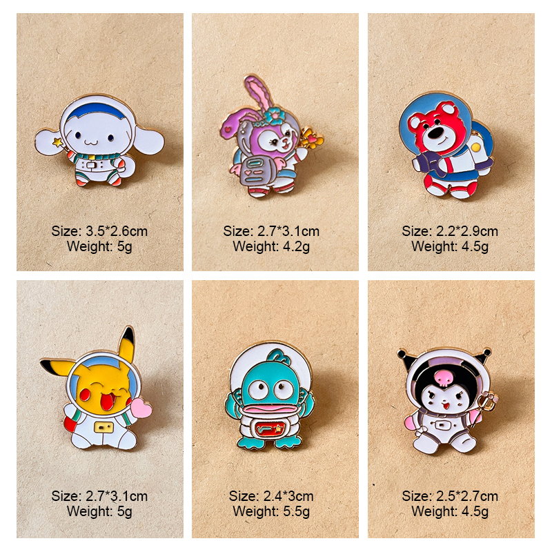 These glossy enamel pins (gold outlines) feature 6 characters (Pikachu, bunny, bear, etc.) in astronaut gear—blending iconic charm with cosmic whimsy. Vibrant, detailed designs add playful space flair to bags/jackets, ideal for fans as beloved fandom keepsakes.
