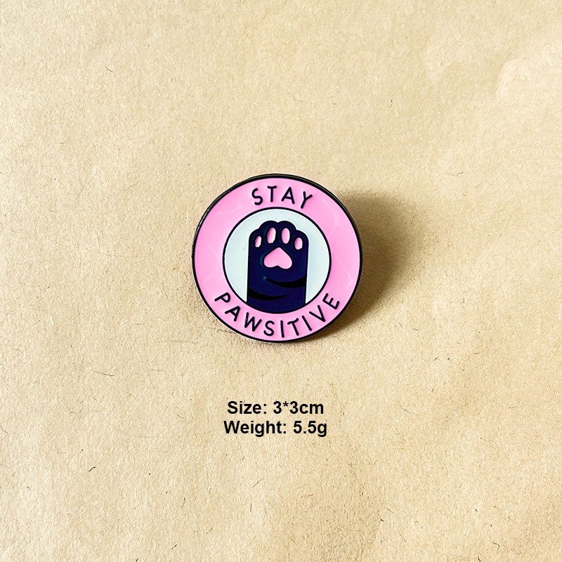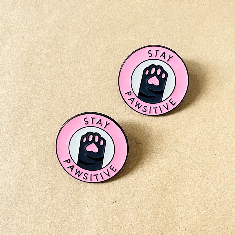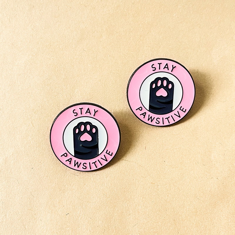 These vibrant pink-and-black enamel pins feature a paw print (with a heart detail) and the playful slogan "STAY PAWSITIVE." Polished, whimsical design adds uplifting charm to bags/jackets—perfect as a cheerful accessory or a heartfelt gift for animal lovers.