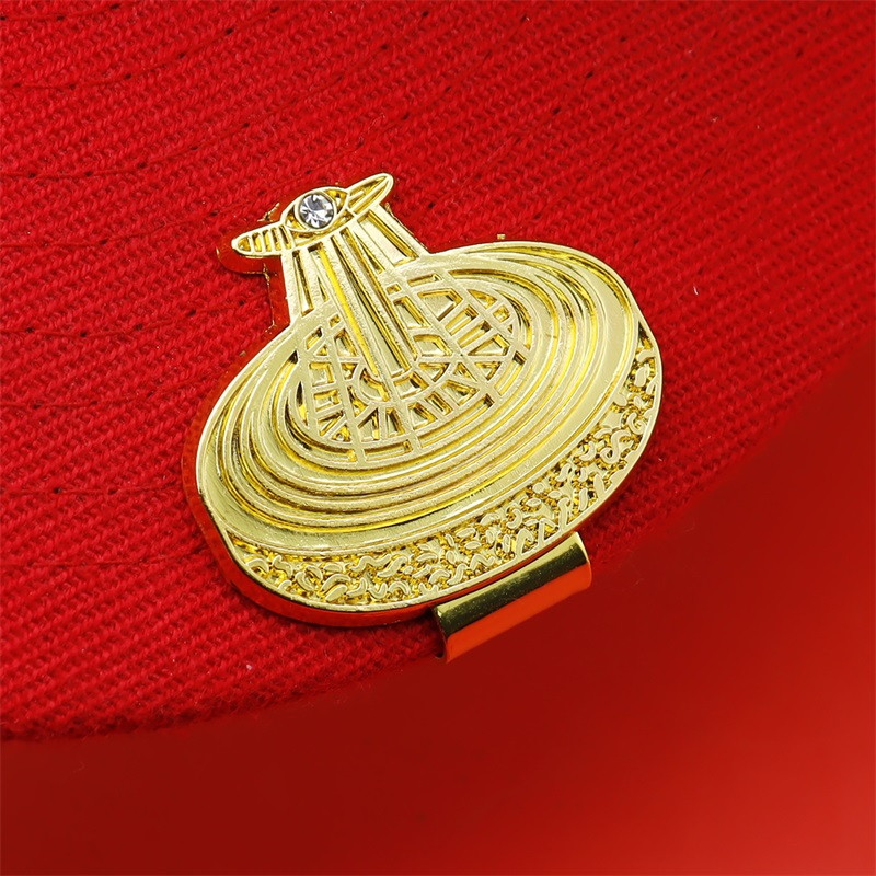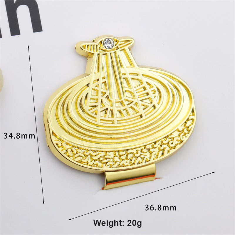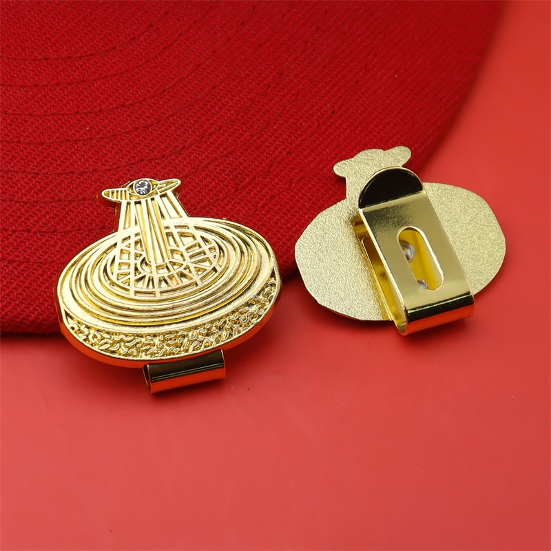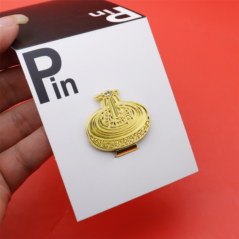 This hat clip features a curved, layered shape (resembling ornate decor) with detailed geometric/filigree patterns. The design blends a glossy gold finish, sparkling accent, and sleek clip structure—merging luxurious aesthetics with practical functionality for a standout accessory.