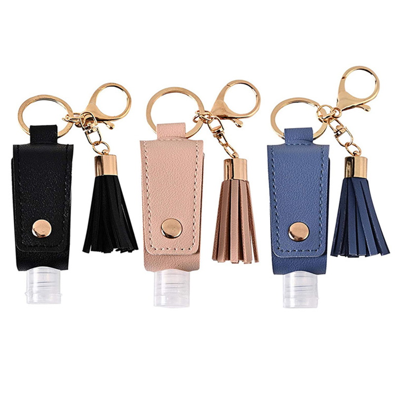 These keychains feature chic leather holders for hand sanitizer, adorned with gold accents and tassels. Their elegant design, in neutral and muted tones, blends functionality with fashion, appealing to style-conscious women seeking trendy, practical accessories.