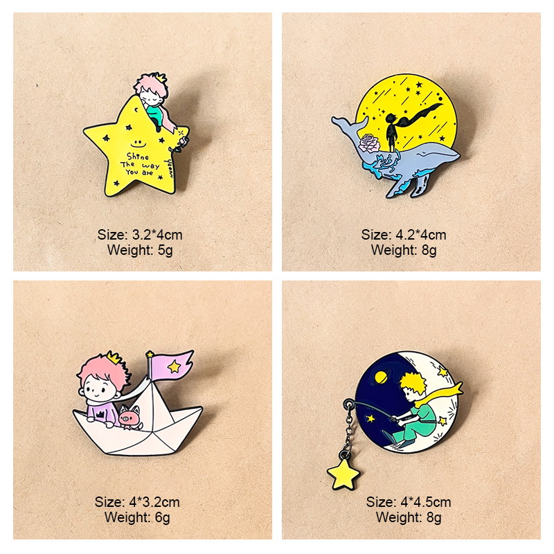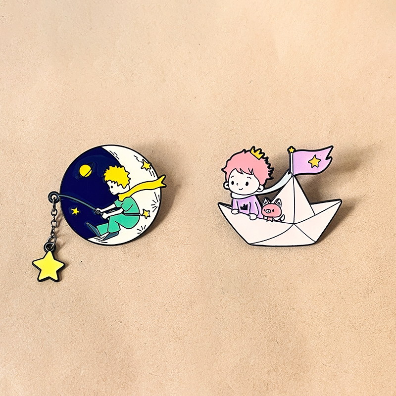 These The Little Prince soft enamel pins feature iconic shapes—the prince, rose in glass dome, fox—with vibrant hues separated by raised metal lines . They adorn blazers, bags, or scarves, letting fans infuse outfits with literary nostalgia and premium tactile charm .