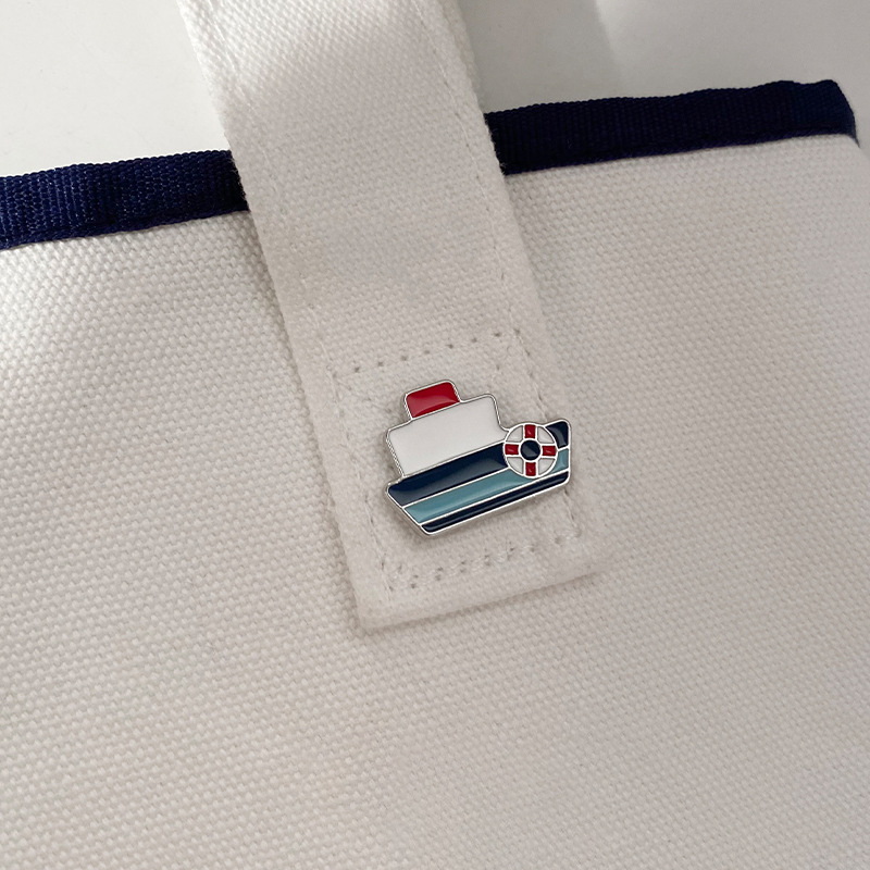 This vibrant pin features a stylized ship with striped hull, white superstructure, and a red-white life preserver—blending playful nautical charm with crisp, colorful design. Perfect for adding coastal flair to bags/jackets or collecting as a cheerful maritime keepsake.