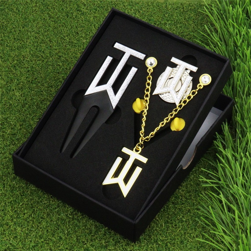These pieces feature distinct logo silhouettes: a chain-adorned logo hat pin and a logo-shaped golf divot tool. Designed with metallic finishes (black/white, silver/gold), sleek contours, and cohesive logo styling, they blend trendy cap decor with practical golf functionality.