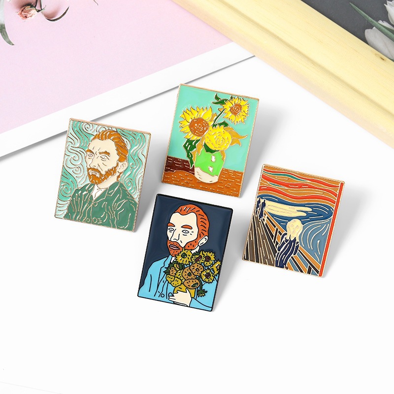 Features iconic works (Van Gogh self-portrait, Sunflowers, The Scream) in vivid enamel with crisp detailing. Ideal for art lovers to decorate bags, blazers, or hats—adds artistic, expressive flair to daily styles or art-themed outfits.