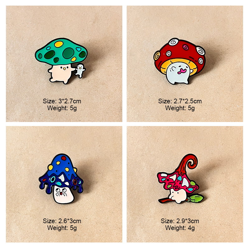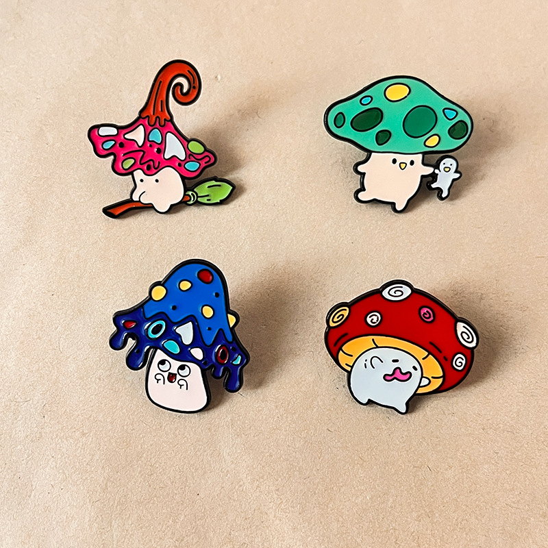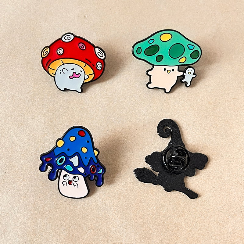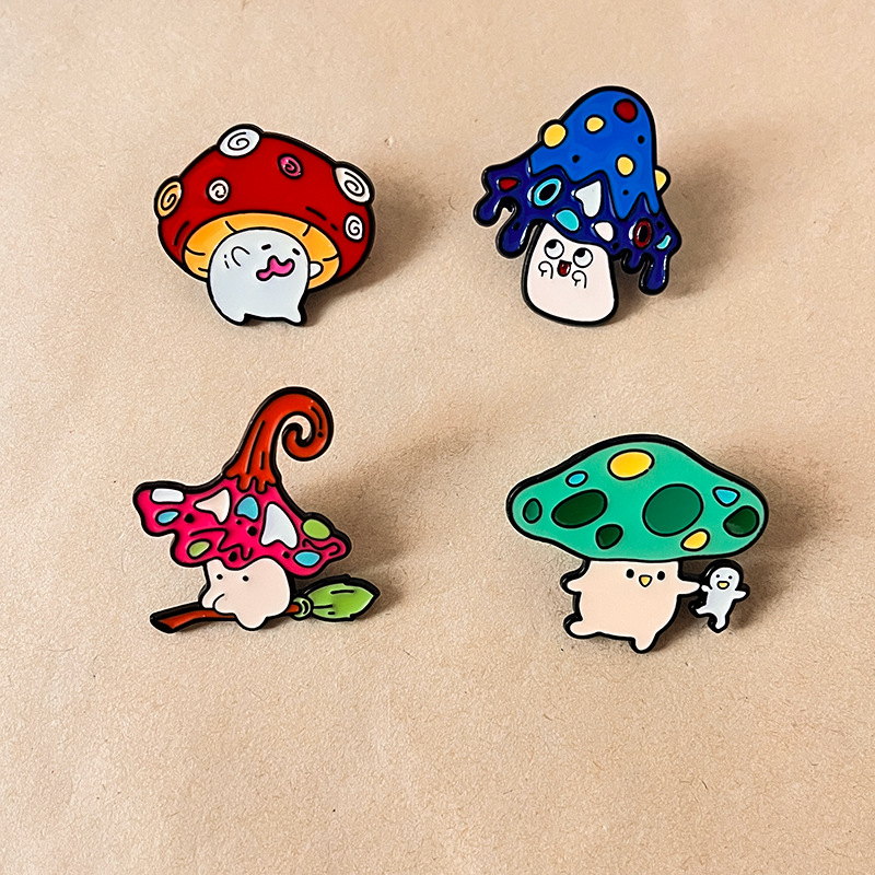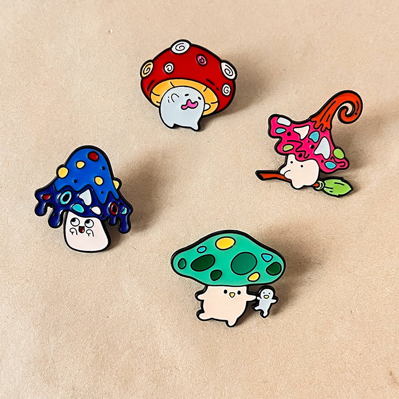 4 quirky pins (mushroom with broom, spotted fungi with ghost, drippy cap, grinning red cap) — vivid enamel, playful expressions. Perfect for adding whimsy to bags/jackets; ideal for fungi lovers’ cute collectibles.
